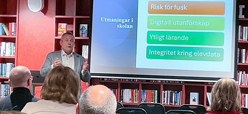På kvällen var det öppen föreläsning på biblioteksscenen. Föreläsare var Thomas Winman, professor i pedagogik och vd på Högskolan för lärande och kommunikation, Jönköping university. Temat ”AI i skolan – Flytta fokus från teknik till lärandet” lockade 24 intresserade deltagare med många frågor. Till hösten fortsätter konceptet med öppna föreläsningar.