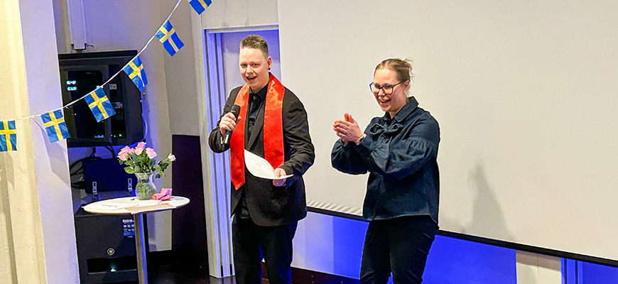 Idag var det dags för examen för de studerande på högskoleutbildningen Förskollärare, FSK22, och yrkeshögskoleutbildningen Produktionsutveckling, PU24. Förutom de studerande var ett 60-tal anhöriga på plats för att fira examensdagen.