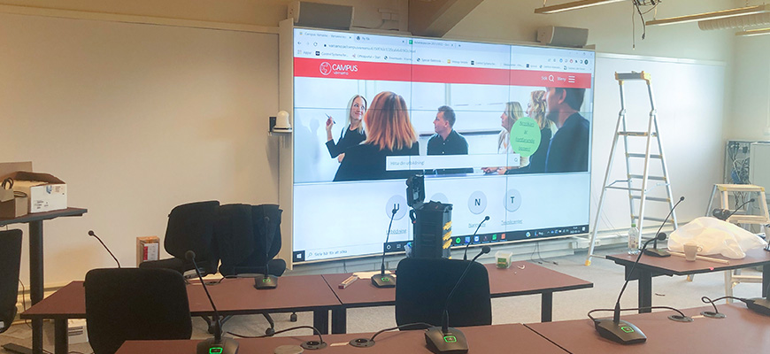 Med en vecka kvar till invigningen jobbas det för fullt i Norhedssalen. Denna skärmväggen består av nio stycken 55-tumsskärmar.