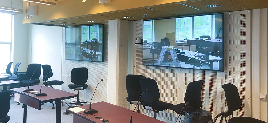 På två 75-tumsskärmar på bakre väggen i lokalen kan föreläsaren se de som är uppkopplade på distans.