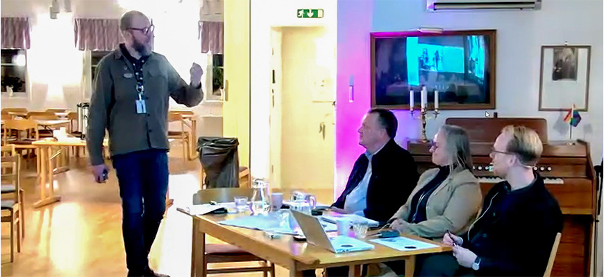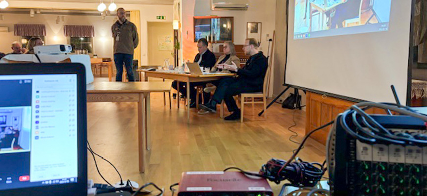 Alla som inte kan delta på plats kan koppla upp sig och följa sändningen digitalt från soffan hemma eller annan valfri plats. Och för att detta ska fungera lika bra som vilken TV-sändning som helst behövs proffs som Campus Värnamos teknikansvarige Rickard som hade full koll på skärmar, ljud, kablar och allt annat. Tarik från Campus Värnamo for runt i lokalen med mikrofonen så att alla frågor skulle höras till alla på distans och i lokalen.