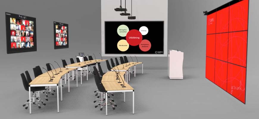 De bakre skärmarna till vänster i bilden är båda på 75" och visar de som är uppkoplade på distans så den som undervisar ska se alla på ungefär samma sätt.