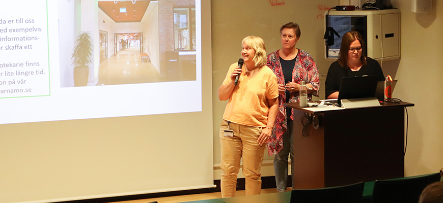 Anna och Hanna berättade om stadsbiblioteket där man kan få hjälp med studentlitteratur, boka grupprum på biblioteket och mycket annat.
