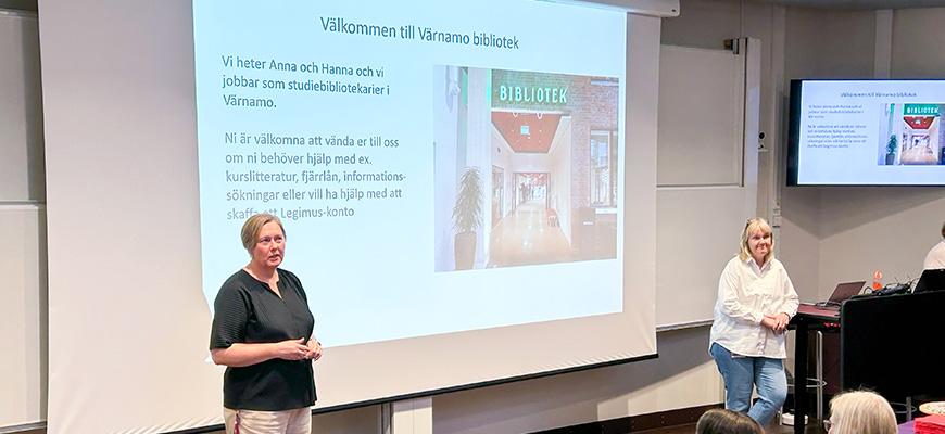Hanna och Anna handleder studenter i informationssökning på Värnamo stadsbibliotek och du kan också få hjälp med att söka litteratur och information till ett projektarbete, och massa annat!