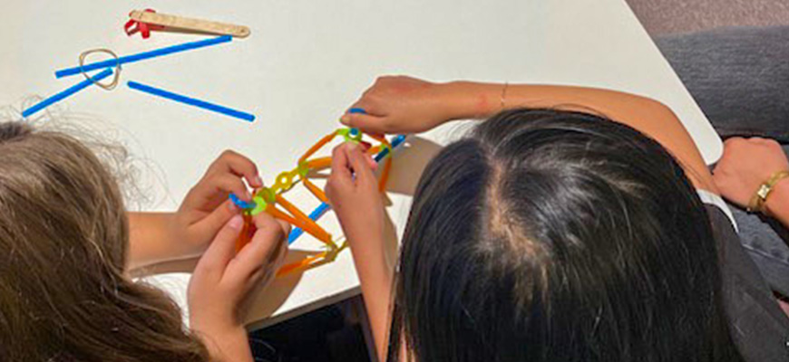 Barnen bygger katapulter med Strawbees material. Under dessa veckor har vi hjälp av två feriearbetare som är handledare och tar hand om barnen.