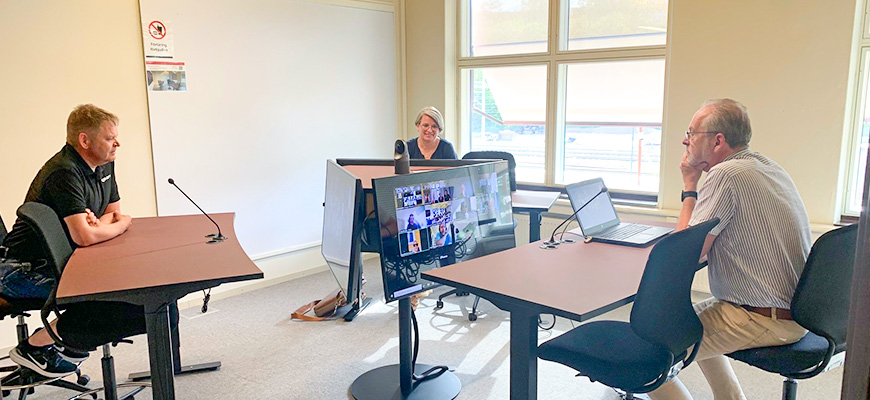 Detlagarna fick vara med på ett digitalt hybridmöte i den senaste Norhedssalen, sal 206. På bilden: Eilert Årseth, Kari Eldby Rygg och Ulf Svensson.
