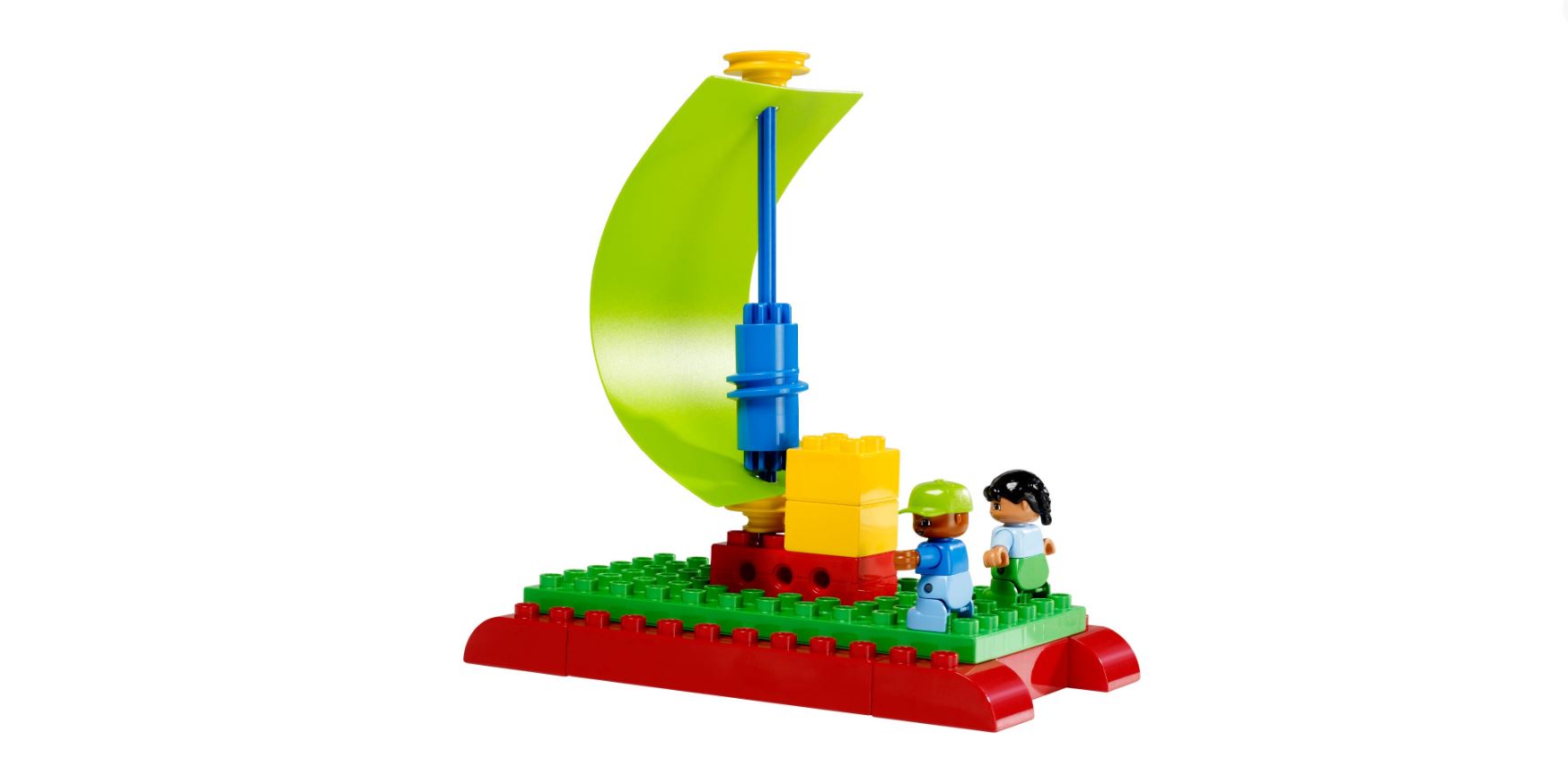 Barnen bygger en flotte av LEGO Duplo klossar och undersöker vilka sorts segel som ger flotten högst fart.