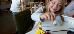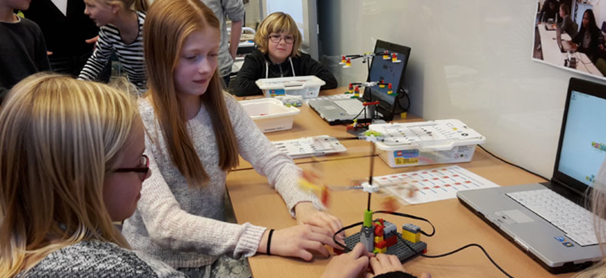 Barnen bygger och programmerar ett lejon av Lego som ställer sig upp och lägger sig ner.